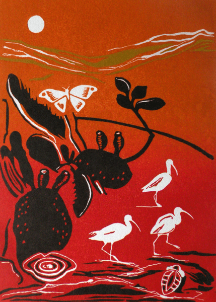 Ibis with Cactus and Sun Moon Birds